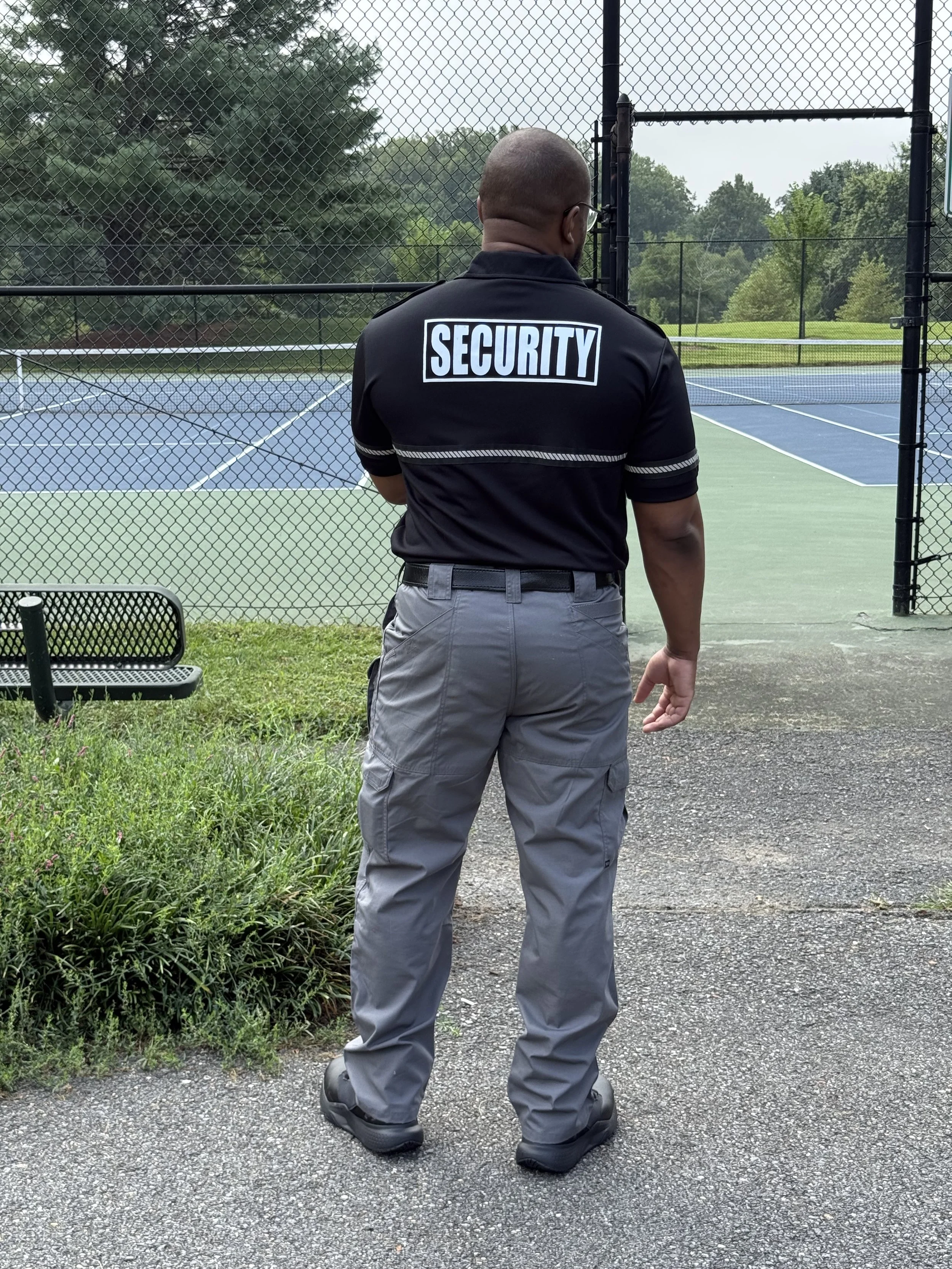 Trained personnel provide surveillance, access control, and conflict resolution without carrying weapons.